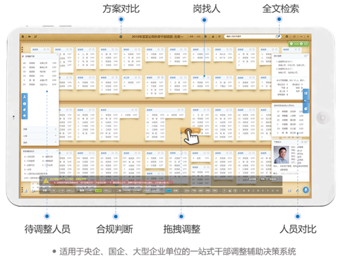 基于移動智能終端的干部調(diào)整輔助決策系統(tǒng),可以代替?zhèn)鹘y(tǒng)的線下干部調(diào)整工作,將干部信息直觀的展現(xiàn)在pad上,通過簡單的拖拽實現(xiàn)干部崗位的調(diào)整,并自動生成調(diào)整方案,調(diào)整過程中也能查看干部的詳細(xì)信息,進(jìn)行多人比對,同時根據(jù)任免規(guī)則自動進(jìn)行合規(guī)判斷,不符合規(guī)則的會報警提醒。采用該產(chǎn)品可針對性解決干部調(diào)整中任免規(guī)則多、人員基數(shù)大、私密性強(qiáng)等痛點問題,大大減輕干部調(diào)整的工作量,輔助用戶合理搭配領(lǐng)導(dǎo)班子。