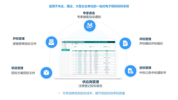 基于互聯(lián)網(wǎng)的電子招標投標系統(tǒng),能代替?zhèn)鹘y(tǒng)的線下招投標工作,實現(xiàn)招投標全流程電子化操作。系統(tǒng)支持工程、物資、服務等采購業(yè)務,滿足公開招標、邀請招標、競爭性談判、詢價、單一來源、比選采購等多種采購方式,支持自主招標和委托代理招標兩種模式。系統(tǒng)具備項目立項、在線發(fā)布公告、在線發(fā)售招標文件、在線遞交投標文件、在線抽取專家、配置評標權重和參數(shù)、在線評標等功能,同時可以自動生成評標報告,有效降低招投標成本,提升招投標效率和質(zhì)量。