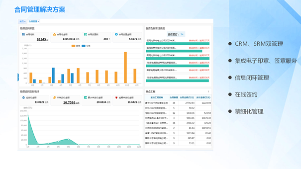合同管理系統(tǒng)為企業(yè)提供合同全生命周期過程管理。該系統(tǒng)以企業(yè)CRM、SRM數(shù)據(jù)為基礎(chǔ),實(shí)現(xiàn)合同條款、合同起草、合同分包、合同變更、發(fā)票、收付款等信息閉環(huán)管理,通過集成第三方簽約服務(wù),實(shí)現(xiàn)合同、訂單的在線簽約,提升企業(yè)合同精細(xì)化管理水平和執(zhí)行效率。