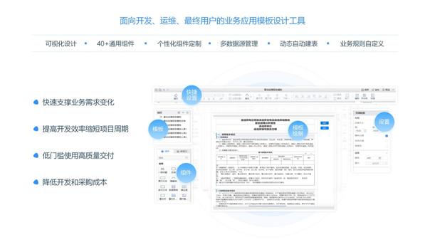 可視化設(shè)計:系統(tǒng)提供文本、表格、圖表等40+種模板組件,用戶基于可視化設(shè)計器,通過拖、拉、拽操作,以“搭積木”的形式,即可搭建出符合業(yè)務(wù)需求的模板;