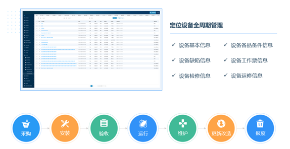 設(shè)備全生命周期管理:從設(shè)備采購、設(shè)備安裝調(diào)試、設(shè)備使用、設(shè)備報廢全過程進行跟蹤,并對設(shè)備使用期間的維修、拆除、驗收、移動等所有操作進行記錄,實現(xiàn)設(shè)備全生命周期管理。