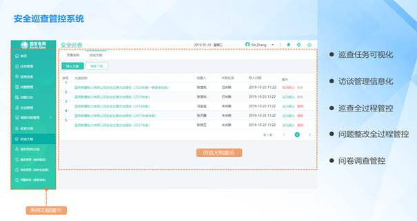 基于移動智能終端的安全巡查管控系統(tǒng),可以代替?zhèn)鹘y(tǒng)的線下紙質(zhì)巡查,在移動端進行問題記錄、領(lǐng)導訪談、問卷調(diào)查等工作,將巡查進度、現(xiàn)場問題按組織機構(gòu)和巡查提綱兩種維度直觀展現(xiàn)在移動端,輔助巡查專家進行現(xiàn)場巡查工作,管理人員亦可遠程實時查看巡查情況并進行管控,同時在巡查結(jié)束后對現(xiàn)場問題進行閉環(huán)整改管理。采用該產(chǎn)品可針對性解決巡查過程中標準難統(tǒng)一、進度難掌握、巡查難覆蓋、問題難閉環(huán)等痛點問題,大大提高現(xiàn)場巡查效率,輔助用戶對巡查工作實時管控。