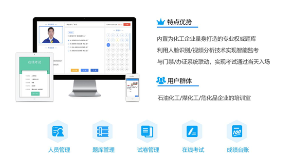 化工行業(yè)承包商入廠考試系統(tǒng),它以《安全生產(chǎn)法》和《企業(yè)安全生產(chǎn)標準化基本規(guī)范》中關于承包商入廠考試的要求為建設依據(jù),包括承包商及人員管理、題庫維護、試卷維護、在線考試、成績臺賬等5個業(yè)務模塊。不僅可以極大的提高入廠考試的效率,做到當天考試當天拿證當天入廠;而且使用人證比對、人臉識別等技術規(guī)避替考行為,還配備有緊跟規(guī)章制度的豐富題庫。