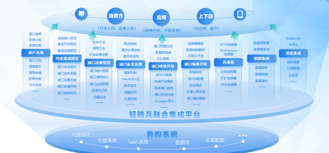 金現(xiàn)代自主研發(fā)的融合集成平臺(iPaaS)已全面升級,一個平臺實現(xiàn)了數(shù)據(jù)、應(yīng)用(API)和消息的全方位集成,通過零代碼、配置化的方式即可完成復(fù)雜的集成任務(wù)。