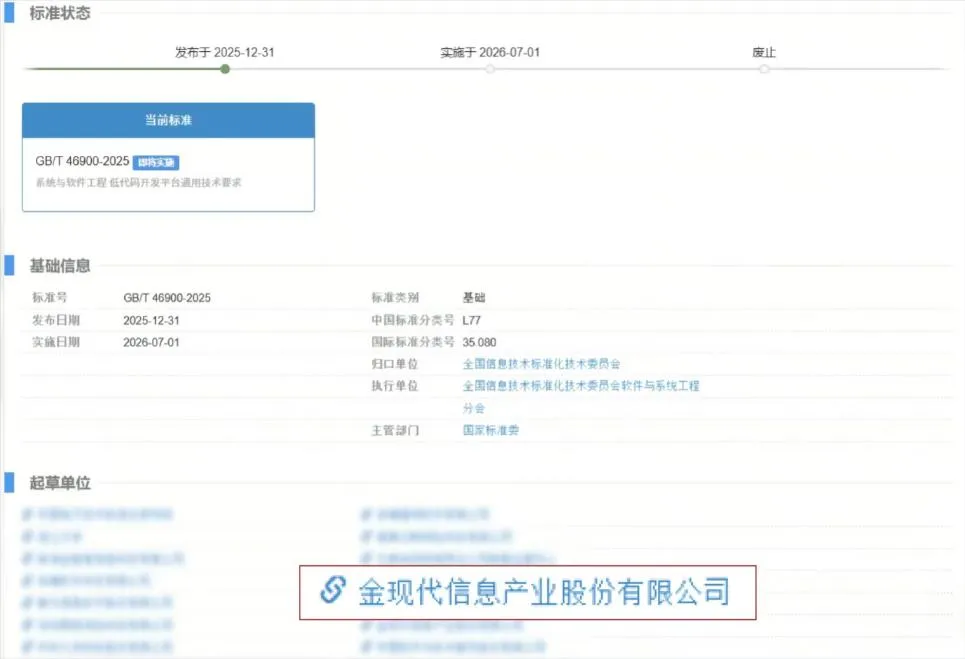 行業(yè)標(biāo)準(zhǔn)的構(gòu)建離不開頭部企業(yè)的技術(shù)沉淀與經(jīng)驗(yàn)輸出。金現(xiàn)代作為本次國(guó)標(biāo)的參與起草單位,在低代碼領(lǐng)域深耕多年,技術(shù)實(shí)力行業(yè)領(lǐng)先。公司已相繼參編國(guó)內(nèi)首個(gè)低代碼開發(fā)平臺(tái)標(biāo)準(zhǔn)、首個(gè)低代碼大模型標(biāo)準(zhǔn)等核心標(biāo)準(zhǔn),是國(guó)內(nèi)首批通過信通院測(cè)評(píng)的18家低代碼廠商之一,是IDC認(rèn)可的“AI+低代碼中國(guó)市場(chǎng)代表廠商”之一。此次參與國(guó)標(biāo)制定,既是對(duì)公司技術(shù)積累的認(rèn)可,也是金現(xiàn)代踐行行業(yè)責(zé)任、推動(dòng)產(chǎn)業(yè)規(guī)范發(fā)展的體現(xiàn)。